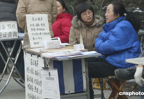 十二月八日,美国大使馆签证处门口的个体服务一条龙生意火爆,前来咨询的北京市民络绎不绝。