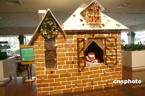 “圣诞节”快来临,杭州商家乘机大做文章,以期迎来一个好赚头。眼下,杭州的大商场、宾馆门口都放满了圣诞树、圣诞礼物。杭州某宾馆用巧克力和糖做了一个圣诞屋招徕顾客。作者:张茵
