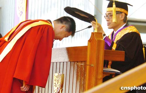 香港中文大学校长刘遵义12月9日为中国首位登上太空的航天员杨利伟,颁授荣誉理学博士学位。作者:宋吉河