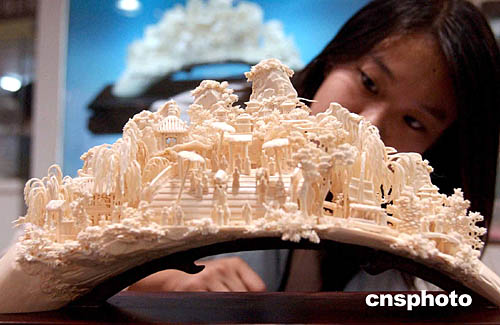 十二月十日,一座长47厘米、高24厘米的精美《清明上河图》象牙雕刻工艺桥,亮相王府井工美大厦四层玉石文化商场。该作品选取明代张择端《清明上河图》画卷中的一个场景,具有很高的艺术欣赏价值和收藏价值。象牙素有“白色的金子”之美誉,因其资源的稀缺性、制品的珍贵性,为收藏价值预留了无限空间。作者:韩艺冰