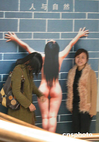 12月11日,在长沙举办的湖南“人与自然”人体摄影展展厅,一名女生(右)欣然站在一幅裸体作品前合影,而另一名经过的女生则不敢正视含羞低头走过。这是湖南首次举办人体艺术摄影展,共展出作品140幅。作者:刘双双