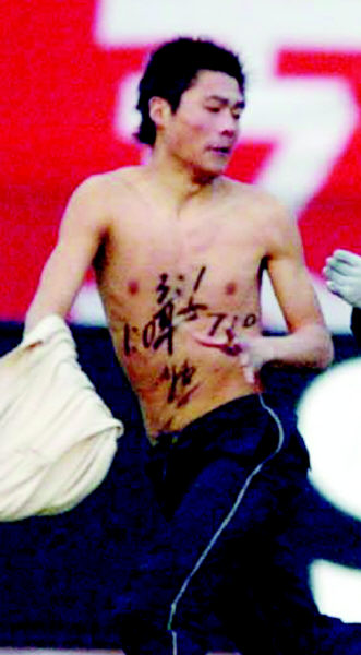 昨天下午,在首届中超杯决赛中,拥有主场之利的鲁能泰山队凭借舒畅和王超的进球,2:0击败联赛冠军深圳健力宝队,如愿将中超杯冠军奖杯留在了济南。在王超打入第二球后,赛场上出现了戏剧性一幕,一名赤膊的年轻球迷突然冲进赛场,上演了国内绿茵场的首次“裸奔”闹剧。