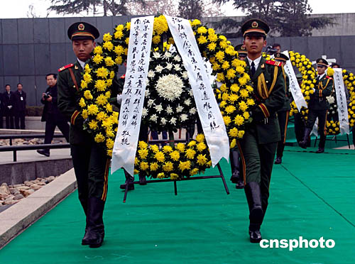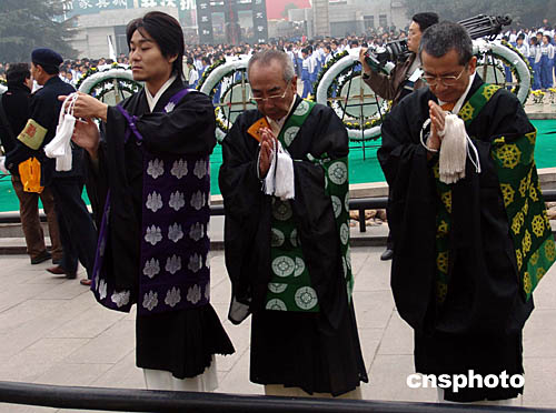 日本东铁路工会、日本佛教徒和平访问团等日本和平友好人士参加了今天的悼念活动。并在会场上打出了“我们决不忘记南京大屠杀的事实”、“反对日本向海外派兵”等横幅标语。