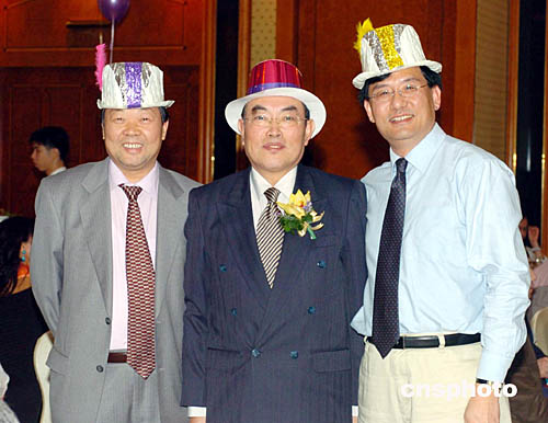 中联办副主任王凤超[中]、中新社香港分社社长章新新、香港文汇报社长张国良[左]在晚宴上。作者:宋吉河