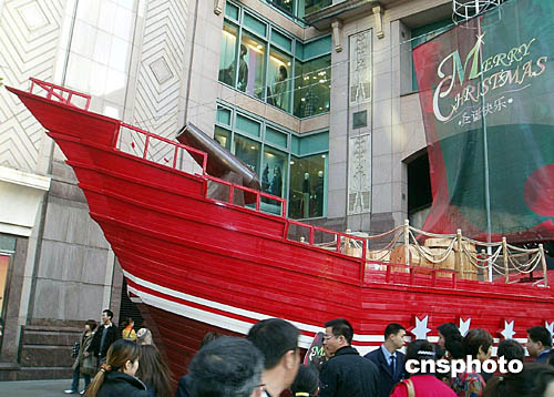 时下,上海圣诞气氛浓,一艘巨型圣诞船新近亮相淮海路,吸引路人驻足观赏。作者:潘索菲