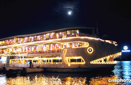越南近年发展旅游业,在西贡河边可载三千游客的巨型鲨鱼游船灯火通明,游客夜游西贡河别有一番风情。作者:周景洛
