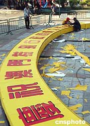 工人正在澳门佑汉公园赶制喜庆牌匾,为庆祝澳门特别行政区成立五周年,十八日澳门街坊总会将在此地举办“金莲吐艳齐鼓舞,彩灯璀璨庆回归”系列大型庆祝活动。作者:梁永强