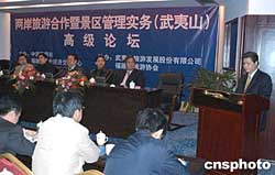 中新社武夷山十二月十六日电(记者杨伏山 黄翔)两岸旅游合作暨景区管理实务高级论坛十六日在风景秀丽的福建武夷山开幕,来自金门、马祖、台湾及祖国大陆的近百名旅游业界及相关人士参加了开幕式。