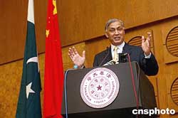 图:巴基斯坦总理阿齐兹在清华大学演讲