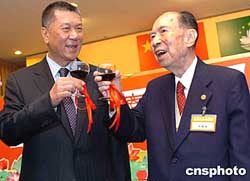 何厚铧与马万祺(右)相互敬酒问候。作者:宋吉河