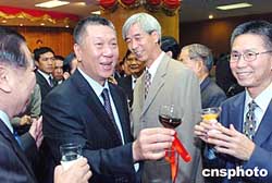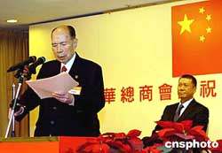 全国政协副主席、澳门中华总商会会长马万祺,16日在澳门中华总商会庆祝澳门特别行政区成立五周年酒会上致辞,澳门特别行政区行政长官何厚铧参加酒会。作者:宋吉河