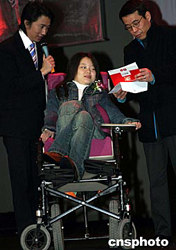 中国数字原创盛会“英特尔·二零零四年度中国数字盛典”颁奖典礼活动十二月十六日晚在北京举行,各方代表、明星嘉宾和十五名Diggi数字原创大奖获得者与会。据悉,本次比赛开创五项之最,即最大规模、最广泛影响力、最权威、最娱乐、最高奖金额,共收到参赛作品近一万五千份。图为用嘴创作FLASH作品、享誉网络世界的闪客田甜(中)在颁奖典礼上担任开奖和颁奖嘉宾。中新社记者:盛佳鹏