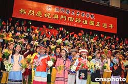 来自小学舞蹈组的五十六位同学,穿着五十六个少数民族的艳丽服装,一一亮相,并表演了《欢聚澳门》歌舞剧。甫下飞机即赶来的潘曼霞不顾劳顿,高歌一曲《我爱你,中国》,赢得满堂喝彩。
