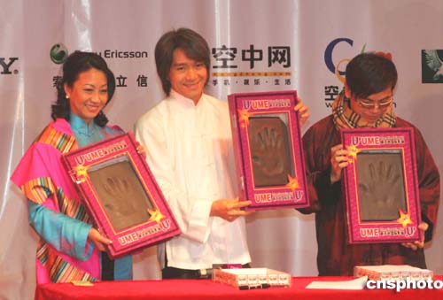十二月十八日晚,从香港巨星周星驰执导兼主演的贺岁影片《功夫》在上海首映,图为周星驰与《功夫》演艺人员在上海留手印祝贺首映成功。作者:潘索菲