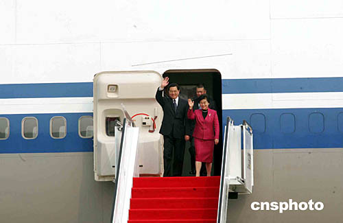 国家主席胡锦涛乘专机抵达澳门国际机场。图为他向前往采访的记者挥手致意。作者:董会峰