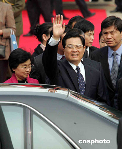 胡锦涛在何厚铧的陪同下,向欢迎的当地民众挥手致意。
