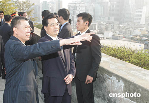 胡锦涛主席在澳门大炮台参观时,行政长官何厚铧向其介绍澳门市政建设情况。