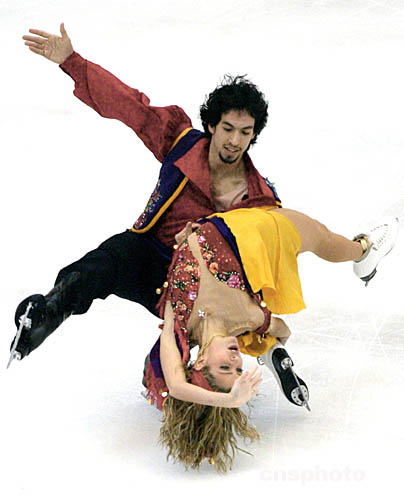 二零零四年十二月十八日晚在北京首都体育馆举行的世界花样滑冰大奖赛总决赛冰舞比赛中,各国选手争相斗艳,上演了一曲曲美仑美奂的冰上盛宴。图为夺得亚军的美国选手贝尔宾/阿冈索在比赛中。中新社记者:武仲林