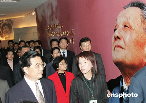 胡锦涛主席在澳门博物馆参观时,注目一幅邓小平的巨大画像。该博物馆内正举办“世纪伟人邓小平”图片展