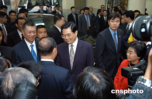 胡锦涛与夫人刘永清在澳门特首何厚铧的陪同下参观澳门劳工子弟学校,受到学校师生的热烈欢迎。