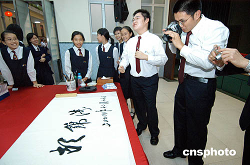 国家主席胡锦涛在参观澳门劳工子弟学校时写下了“胡锦涛”三字墨宝,引来学生争相拍摄。