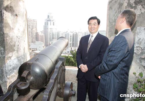 12月19日下午,首次到达澳门的胡锦涛主席饶有兴趣地参观了当地著名景点大炮台。作者:宗金柱