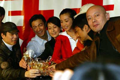 中新网12月21日电 据北京娱乐信报报道,昨(20)晚,为了庆祝《天下无贼》票房突破8000万元大关,主创冯小刚、刘德华、刘若英、葛优、李冰冰、王宝强、尤勇、张涵予等众明星在东方新世纪影城大摆庆功宴。