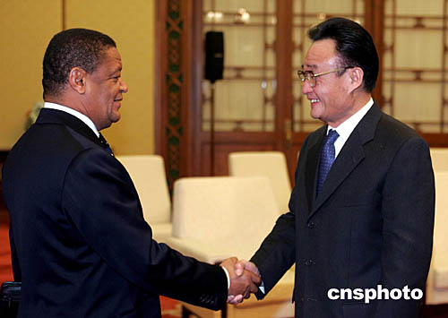 中新社北京十二月二十一日电(记者邢利宇)全国人大常委会委员长吴邦国今日下午在人民大会堂会见了埃塞俄比亚议会联邦院议长穆拉图一行。
