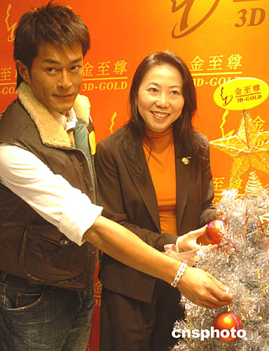 香港影视红星古天乐(左)23日在香港金至尊主席伍绮媚的陪同下﹐出席铜锣湾又一新店的开业仪式﹐并许下圣诞愿望挂于树上﹐求得平安。
