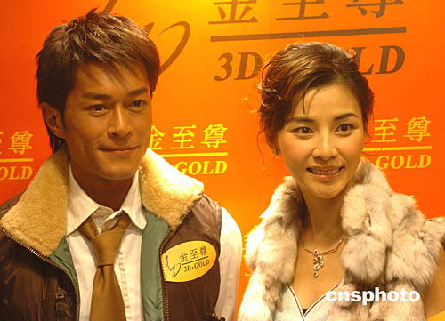 香港影视红星古天乐﹑蒙嘉慧23日在香港出席金至尊铜锣湾又一新店的开业仪式