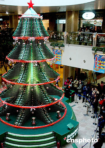 十二月二十四日,一座用啤酒瓶搭建的巨型“圣诞树”亮相北京东方广场,吸引过往行人驻足观看。作者:韩艺冰