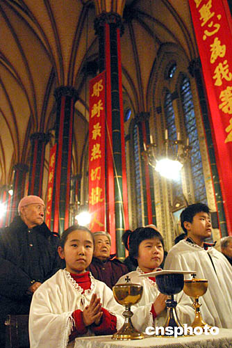 北京西什库天主教堂举行盛大弥撒。图为奉献班的孩子在弥撒中。作者:张勤