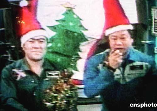 据十二月二十五日美国CNN报道,正在国际空间站的历史上第一位美籍华裔站长焦立中(右),与俄罗斯宇航员沙里科夫共同从太空向地球人说,我们祝你圣诞快乐,新年愉快。(电视画面)作者:贾国荣