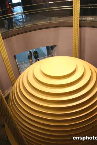 台北101大楼八十九层观景台12月28日下午向媒体开放,楼内安装的世界最大风阻尼器引人注目。该风阻尼器球体直径五点五米,重达六百六十公吨,从大楼九十二层悬挂到八十八层,对因地震、强风造成的水平偏移能产生百分之四十以上的反作用,是世界最大也是唯一外露的风阻尼器。作者:黄少华
