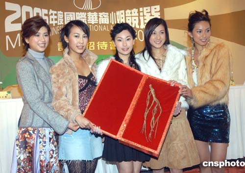 《2005年度国际华裔小姐竞选》记者会12月29日在香港举行,应届港姐季军符思思(左一)、04年度国际华裔小姐亚军曹敏莉(左二)、04年度国际华裔小姐冠军钟嘉欣(右二)、应届港姐亚军朱慧敏(右一)会上向徐子珊送上千年人参,以示鼓励及支持。作者:邓庆乐