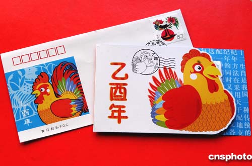 北京市邮票公司为配合国家邮政局于2005年1月5日发行《乙酉年》特种邮票(1套1枚),特设计印制了该邮票的首日封(左)、邮折(右)邮册卡书等邮品,并将与邮票同日发行。《乙酉年》特种邮票面值人民币80分,是中国发行的第三轮生肖邮票的第二套。在十二生肖排序中,鸡象征着振奋和吉祥,故民俗中有“金鸡报晓”和“金鸡起舞”等说法。作者:邹宪