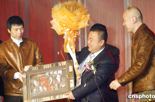 十二月三十日,中国知名家具企业——曲美家具公司在北京顺义的“曲美工业园”举行曲美二零零五经销商年会暨新产品发布会,历届金鸡、百花奖最佳男演员得主、北京曲美家具形象代言人葛优(右),与中国著名导演冯小刚(左)亲临现场,向北京曲美家具公司总裁赵瑞海先生(中)赠送《天下无贼》经典剧照以表示祝贺。作者:盛佳鹏