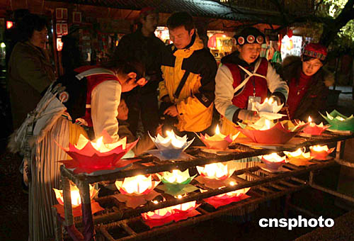 年终岁末,世界文化遗产--云南省丽江古城夜幕降临后,盛装的纳西族姑娘在穿行古城的清清山泉溪水畔出售色彩各异的河灯,供同胞和游客在清冽的水中放河灯以许下来年美好的心愿。中新社记者:任晨鸣