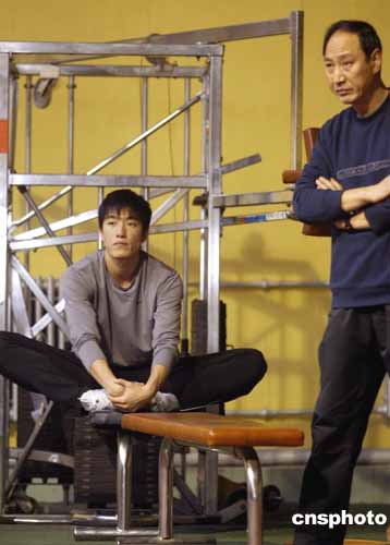 十二月三十一日,在雅典奥运会夺得男子一百一十米栏冠军的刘翔,在北京国家体育总局训练局的室内训练场内刻苦训练。