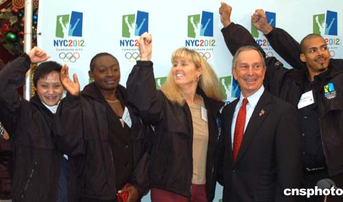 当地时间二零零四年十二月三十一日,包括昔日中国“跳水皇后”高敏(左一)在内的八名奥运冠军在应邀作为嘉宾出席纽约奥申委举办的纽约申办二零一二年奥运会活动,和纽约市长布隆博格(右二)一起为纽约申奥成功加油。作者:赵海燕