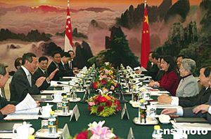 中国国务院副总理吴仪与新加坡副总理李显龙举行会谈。中新社记者:满会乔