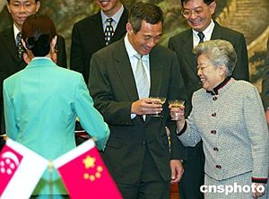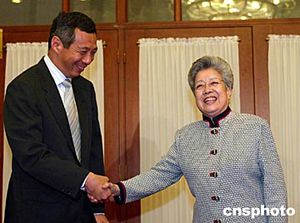 五月十四日,中国国务院副总理吴仪在北京会见新加坡副总理李显龙。中新社记者:满会乔