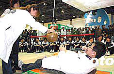 二零零四年全国科技活动周暨北京科技周于五月十五日在北京展览馆隆重举行,一位“气功大师”通过现场表演的形式普及科学知识,提高公众科学素养。作者:徐曦弋