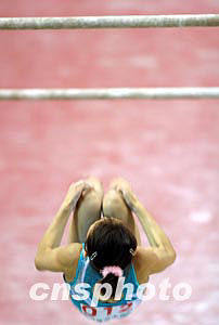 2004年5月15日,2004全国体操锦标赛暨奥运会预选赛的女子资格赛在江苏省苏州市体育中心体育馆举行,来自全国19个省市的代表队参加了此次比赛。图为女子高低杠比赛。中新社记者:盛佳鹏