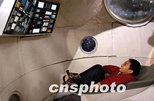 五月十五日,一名北京学童在当日开幕的2004年全国科技活动周暨北京科技周展会上,模拟中国首位宇航员杨利伟乘坐神舟五号载人飞船太空仓的座椅上,用心感受太空飞行的乐趣。中新社记者:邹宪