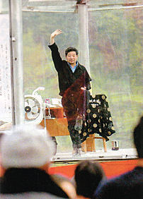 5月7日下午3时35分,绝食49天的陈建民在医务人员搀扶下走出玻璃房进入升降机。他的体重由49天前的69公斤降到了现在的49公斤。