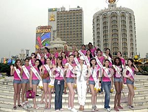 参加由澳门博彩股份有限公司承办的“世界名模在澳门”活动的第十六届世界模特小姐大赛三十国冠军佳丽十七日首次汇聚濠江,在澳门著名的葡京酒店前广场合影,展示风采。中新社记者:李刚