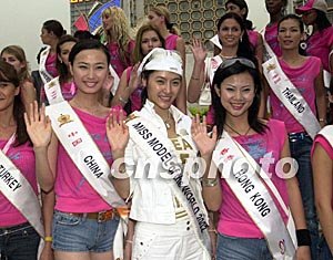 参加由澳门博彩股份有限公司承办的“世界名模在澳门”活动的第十六届世界模特小姐大赛三十国冠军佳丽十七日首次汇聚濠江,在澳门著名的葡京酒店前广场展示风采,图为中国区冠军马力(左)、上届世界冠军延魏(中)和香港冠军张颖向澳门致意。中新社记者:李刚