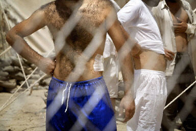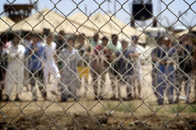 5月17日,一些伊拉克囚犯站在巴格达西郊的阿布格莱布监狱铁丝网后。