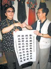 谈到变脸风波,曾金贵真诚地对彭登怀说了声“对不起”。“正像我这副字上面写的,我只是一个老顽童,彭大师才是真正的变脸大师。我今天就是要向彭登怀表达我的歉意,但是川湘情意浓却是大家都希望的。”“对,川湘情意浓!”彭登怀连连点头。
